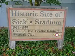 The site was previously the location of Dugdale Field, a 1913 ballpark that was the home of the Rainiers' forerunners, the Seattle Indians. That park burned down in an Independence Day arson fire in 1932, caused by serial arsonist Robert Driscoll.[4] Authorities would later claim that Driscoll was one of the most dangerous arsonists[5] in the United States during the Great Depression. Until a new stadium could be built on the Dugdale site, the team played at Civic Field, a converted football stadium at the current location of Seattle Center's Memorial Stadium.