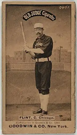 Flint's financial difficulties continued as his career progressed, worsened by fines he incurred for his drinking and rowdy behavior. His Chicago teammate Billy Sunday said he thought Flint's alcohol use was an attempt to deal with the pain he endured while playing catcher with his bare hands.[5] In 1883, a man in Florida wrote to National League president Albert Spalding and told him that Flint and pitcher Ned Williamson refused to pay him back for a loan. Spalding threatened to kick the two players out of the league, but they paid their debt and the story was kept out of newspapers.[7]