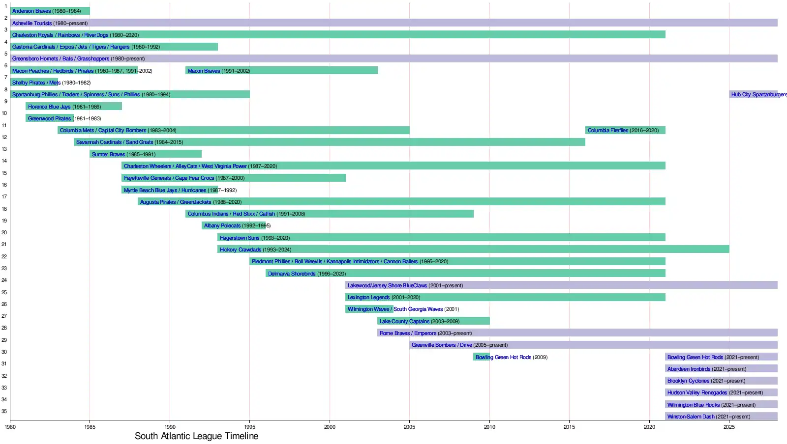 South Atlantic League teams (1980–present)