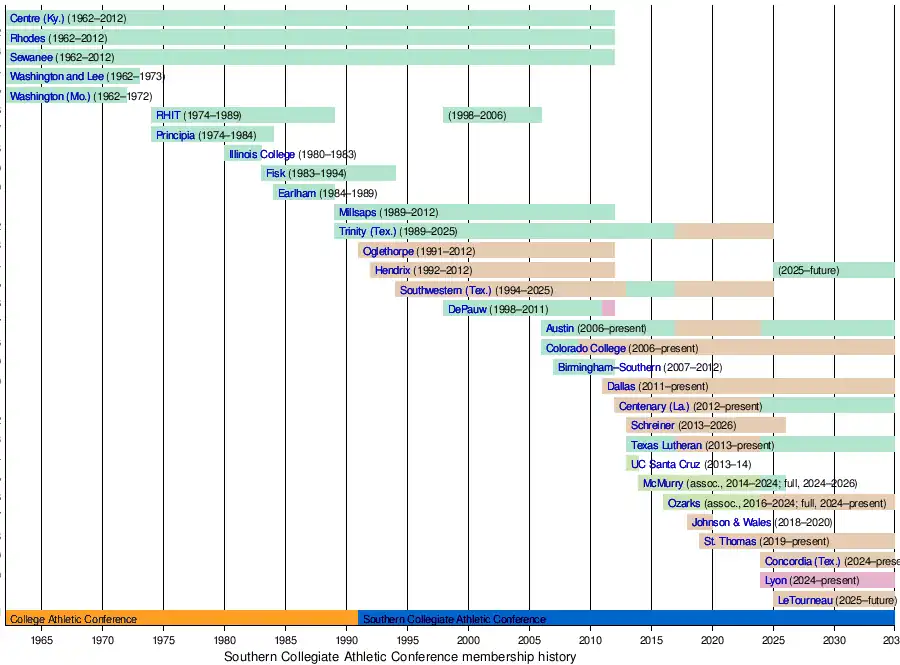 - Trinity (Tex.) and Southwestern (Tex.) left the SCAC to join the Southern Athletic Association (SAA) after the 2024–25 academic year.