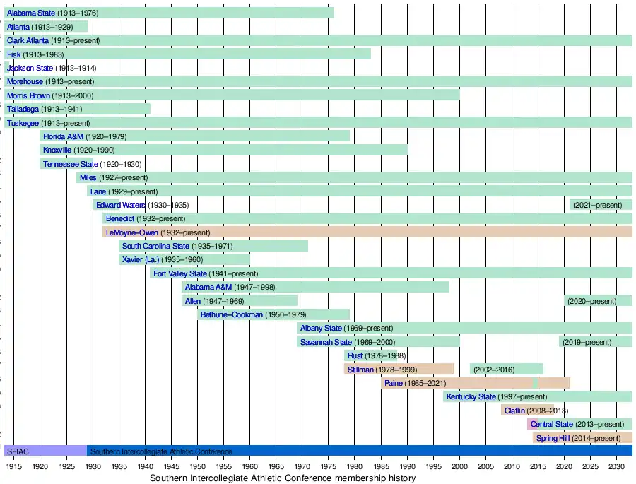 Only three charter members are still part of the conference—Clark Atlanta University (formerly Clark College), Tuskegee University, and Morehouse (which briefly left before returning). Before 2014, all members had been southern HBCUs, but four of the SIAC's five newest members include its only non-HBCU, Spring Hill College (joined in 2014), and its only member outside the South, Central State University of Ohio (joined in 2015). Their last three recent members were former member schools in their first stints: Savannah State University returned to the SIAC in 2019 after a 19-year absence, Allen University returned to the SIAC in 2020 after a 51-year absence, and Edward Waters University returned to the SIAC in 2021 after a nearly 86-year absence. The U.S. Army's 24th Infantry Division teams competed as members of the SIAC from 1930 until 1935.[2]