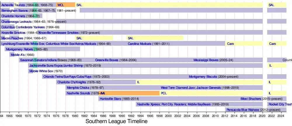 The Double-A SALLY League dissolved after the 1963 season and refounded itself as the Southern League. The newly minted league wanted to distance itself from the SALLY League's past history in the low minors. Additionally, many leagues had contributed to its legacy. For these reasons, it elected to start with a clean slate and does not claim the original SALLY League's history or records as its own.[3] In its inaugural campaign, the six-team Southern League consisted of the Asheville Tourists, Birmingham Barons, Charlotte Hornets, Chattanooga Lookouts, Columbus Confederate Yankees, Knoxville Smokies, Lynchburg White Sox, and Macon Peaches.[1] Sam C. Smith, the last president of the SALLY League, served as president of the new Southern League.[3]