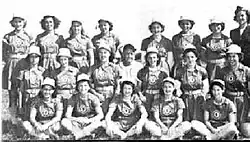 Front row, L-R: Zonia Vialat, Virginia Bell, Margaret Murray, Doris Neal, Ruby Stephens. Second row, L-R: Shirley Stovroff, Jane Stoll, Patricia Scott, Carson Bigbee (manager), Margaret Wenzell, Evelyn Wawryshyn, Julie Gutz. Back row, L-R: Mildred Meacham, June Schofield, Esther Hershey, Erma Bergmann, Doris Barr, Barbara Barbaze, Jean Marlowe, Mary Rudis (chaperone).