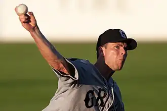Saints pitcher Mitch Wylie during a 2009 game wearing the uniform of the Homestead Grays in honor of Minnesota's contribution to African-Americans in baseball.