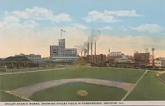 Staley Field was also used by the company baseball team during the summer months, and Halas also played on that team. The field was also used by the Decatur entry in the Three-I League in 1915 and 1922–23.[2]