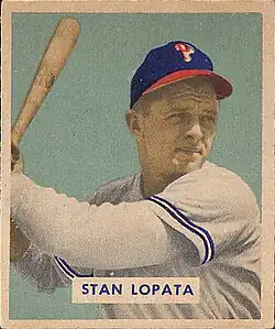 On February 6, 1949, Lopata signed a contract with the Philadelphia Phillies, joining five other catchers on the squad going into spring training.[13] The rookie impressed manager Eddie Sawyer so much in spring training that he initially won the role of starting catcher from six-year veteran Andy Seminick, citing that he was "the most improved player on the club."[14] He was said to be a product of club President Bob Carpenter's "youth movement."[15] The Phillies had the youngest team in the majors that year, calling themselves the "Fighting Phillies of '49,"[16] determined to improve upon their dreadful record of 66–88 from the 1948 season.[3] Despite having the starting job, Lopata split time with Seminick, eventually playing in less games than Seminick and also providing much less offensive support. Despite putting up relatively average numbers of a .271 batting average, 8 home runs, and 27 RBI in 83 games, the 23-year-old's first full season was generally regarded as a success. One reporter recalled that Lopata "hit one of the longest homers Sunday at Shibe Park since the days of (Jimmie) Foxx."[17]