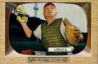 Before the 1955 season, some teams expressed interest in acquiring the newly rejuvenated Lopata from the Phillies, including the upstart Milwaukee Braves. Phillies General Manager Roy Hamey recalled Lopata's performance from the 1954 season, saying that he thought Lopata was one of the better catchers in the league for the last three months of the season. The Phillies intended to keep Lopata on their squad.[29] Initially, Lopata split time with Burgess, but on April 30, Burgess was traded to the Cincinnati Reds for former Phillies starting catcher Andy Seminick.[30] Nonetheless, Lopata continued his stellar play, raising enough eyebrows that he joined the National League all-stars as a replacement for the injured Brooklyn Dodger all-time great Roy Campanella.[31] In the 1955 All-Star Game, Lopata pinch hit for former teammate Smoky Burgess with the National League losing 5–0. He reached first base on an error, allowing Hank Aaron to score their first run of the game. The National League would go on to win 6–5 in 12 innings, with Lopata staying in to finish the game.[32]