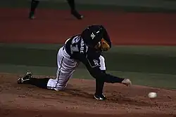Japanese pitcher Shunsuke Watanabe is known as "Mr. Submarine" in Japan. Watanabe has an even lower release point than the typical submarine pitcher, dropping his pivot knee so low that it scrapes the ground. He now wears a pad under his uniform to avoid injuring his knee. His release is so low that his knuckles often become raw from their periodic drag on the ground.