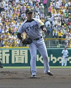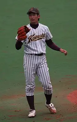He won another game against the Dragons on April 24.[15] He formed a battery with fellow rookie Ryutaro Umeno on May 7, the first time since both rookies Yuya Ando and Ryo Asai started an official game in 2002.[16] But he earned his first loss that day when he gave up 6 runs, and the Tigers lost 0–7 to the Dragons.[17] He went for five more starts without securing a win until July 5, where he pitched 131 throws with Umeno in 7 shutout innings against the Baystars.[18] This was the first time in 31 years that a Hanshin rookie battery won an official game since rookies Susumu Mikoshiba and Katsuhiko Kido did so in 1983.[19]