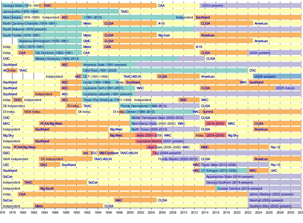 Longtime Sun Belt member Western Kentucky joined the Sun Belt's football conference in 2009 after its board of regents voted to upgrade the school's football program to Division I FBS.[4]