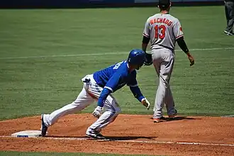 In baseball, to tag up is for a baserunner to retouch or remain on their starting base (the time-of-pitch base) until (after) the ball is first touched by a fielder. By rule, baserunners must tag up when a hit ball is caught by a fielder before it bounces, and in such situations, the baserunners are out if any fielder with possession of the ball touches their starting base before they do. After a legal tag up, runners are free to try and advance, even if the ball was caught in foul territory.[1] On long fly ball outs, runners can often gain a base. When a runner scores by these means, it is known as a sacrifice fly.[2] On short fly balls, runners rarely attempt to advance after tagging up, due to the high risk of being thrown out.