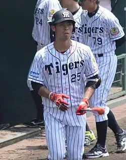 He was the Hanshin Tigers' 3rd pick in the 2014 Nippon Professional Baseball draft.[6][7] On November 26, he signed a contract for an annual salary of 10 million yen, plus a signing bonus of 60 million.[7] He was assigned the jersey number 25, formerly owned by his Komazawa University senior, Takahiro Arai (played for the Hanshin Tigers until 2014 season).[8]