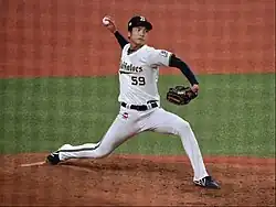 With an overhand delivery, he throws a four-seam fastball averaging 145 km/h (tops out at 151 km/h), a forkball clocked at low 130s, an occasional curveball, and a solid slider that ranges from 120 to 140 km/h.[8] His fastest pitch ever recorded was a 153 km/h fastball, thrown during spring camp training.[9]