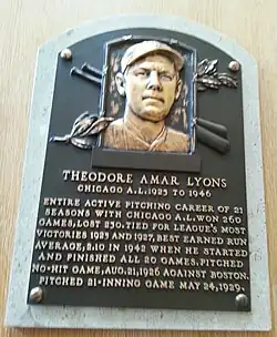 Lyons was inducted into the Baseball Hall of Fame in 1955. He has the fourth-highest career ERA among Hall of Fame pitchers,[2] and is the only Hall of Fame pitcher to have more walks than strikeouts. In 1981 Lawrence Ritter and Donald Honig included Lyons in their book The 100 Greatest Baseball Players of All Time.