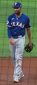 Despite leading the American League West for most of the season and finishing with the same record as the rival and defending champion Houston Astros, they finished second due to the Astros owning the tiebreaker as a result of taking the season series.[66] The Rangers defeated the Tampa Bay Rays in the ALWCS in a two-game sweep and the Baltimore Orioles in a three-game sweep in the ALDS to advance to the ALCS for the first time since 2011, in which they beat their division and Lone Star Series rival, and defending World Series champions Astros in seven games to claim their first pennant since 2011. The Rangers went 13–4 in the postseason, going 2–4 at home and 11–0 on the road, the most road wins in a postseason in MLB history.[67][68] The postseason was marked by performances by All-Star players Nathan Eovaldi, Corey Seager and Adolis García, with Eovaldi matching the record number of wins by a pitcher in a single postseason with 5, Seager winning World Series MVP and Garcia winning ALCS MVP.[69][70][71] On November 1, the Rangers won the 2023 World Series after defeating the Arizona Diamondbacks in five games, achieving their first World Series championship in franchise history.[72][73][74][75]