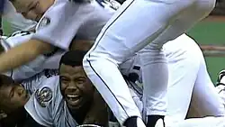 In the bottom half of the inning, Yankees ace Jack McDowell, who had entered the game in the 9th inning for a rare relief appearance, faced Joey Cora, Ken Griffey Jr., and Edgar Martínez—the second, third, and fourth batters in the Mariners' order, respectively.[18] Second baseman Cora dragged a bunt down the first base line and reached first base safely on an infield hit.[18] Yankees manager Buck Showalter argued the call, believing Cora should have been called out for running off the baselines; however, the umpires' ruling stood. Center fielder Griffey singled to short right-center field, allowing Cora to reach third base.[18] Designated hitter Martinez then doubled down the left field line, scoring Cora with the tying run and Griffey with the winning run.[18] The Mariners' dugout emptied and mobbed Griffey, Martinez, and Cora on the field in celebration of the franchise's first ever playoff series victory.
