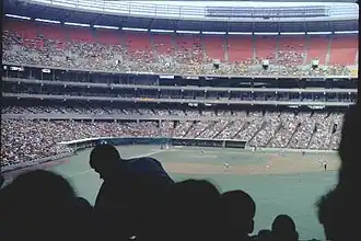 Three Rivers Stadium was similar in design to other stadiums built in the 1960s and 1970s, such as RFK Stadium in Washington, Atlanta-Fulton County Stadium in Atlanta Shea Stadium in New York, Riverfront Stadium in Cincinnati, the Houston Astrodome, Veterans Stadium in Philadelphia, and Busch Memorial Stadium in St. Louis, which were designed as multi-purpose facilities to maximize efficiency.[32][33] Due to their similar design these stadiums were nicknamed "cookie-cutter" or "concrete doughnut" ballparks.[11] The sight lines were more favorable to football; almost 70% of the seats in the baseball configuration were in fair territory.[11] It originally seated 50,611 for baseball,[11] but several expansions over the years brought it to 58,729.[34] In 1993, the Pirates placed tarps on most of the upper deck to create a better baseball atmosphere, reducing capacity to 47,687.[11][35][36]