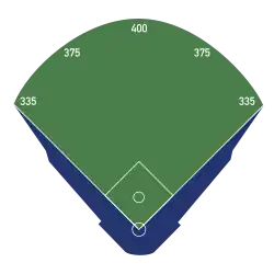 | Field size | Left Field — 335 ft / 102 m Left-Center — 375 ft / 114 m Center Field — 400 ft / 122 m Right-Center — 375 ft / 114 m Right Field — 335 ft / 102 m Wall height — 10 ft / 3 m ![]() |