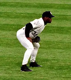 In his first season in the American League, Raines hit for a .268 average but with a .359 on-base percentage; he was second on the team in runs scored as the White Sox finished the season in second place in the American League Western Division. His average improved in 1992 to .294 with a .380 on-base percentage. In 1993, despite missing nearly six weeks in April and May due to a torn ligament in his thumb he sustained while stealing a base, he managed to hit .306 with 16 home runs as the White Sox won the American League Western Division title.[24] In the 1993 American League Championship Series against the Toronto Blue Jays, Raines posted a .444 batting average and scored five runs in a losing cause.[25]