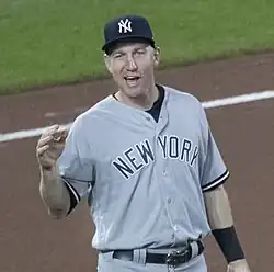 On July 18, 2017, the White Sox traded Frazier, Tommy Kahnle, and David Robertson to the New York Yankees for Blake Rutherford, Tyler Clippard, Ian Clarkin, and Tito Polo.[35] Upon Frazier's arrival in New York, he changed his jersey number from No. 21 to No. 29, as No. 21 was unofficially retired by the Yankees for outfielder Paul O'Neill (the Yankees retired O'Neill's number in 2022). Frazier had worn No. 21 throughout his entire career in honor of O'Neill, as he had grown up a Yankees fan in New Jersey. Frazier had stated that he hoped to speak to O'Neill to gain permission to wear the number; however, clubhouse manager Rob Cucuzza told Frazier that it would not happen.[36][37]