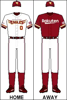 The Eagles' team color is crimson red, the corporate color of its parent company, Rakuten. Yellow was added as an accent color to represent a golden eagle. The team's logo applies a golden eagle motif to the word "Eagles", which has wings added to its left and right sides. The word "Rakuten" sits at atop in a smaller, simpler font.[89] The winged "E" from this logo also serves as the team's cap insignia. The club's home and away uniforms both include the same crimson caps bearing this insignia. Starting with the 2020 season, '47 supplies the caps for the team. Their glossy helmets mimic the cap design and are created using a traditional Miyagi Prefecture lacquer technique called tamamushi-nuri.[90] The supplier of Rakuten's uniforms has changed several times. At the start of the 2011 season, Descente provided all of the team's uniforms and apparel.[91] Then, from 2014 to 2019, the team had a contract with Majestic Athletic, the then-supplier of MLB.[92] Since the start of the 2020 season, Mizuno Corporation has supplied the uniforms and apparel for the Eagles.[90] The Eagles' uniforms bear the logos of various sponsors on the jersey, pants, cap, and helmet.[93]