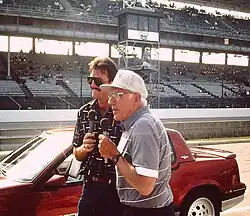 At that time Carnegie, who knew nothing about auto racing, had no advance preparation for the event. All he had was a list of drivers and the numbers of their racecars. As with all the other spectators, Carnegie could not see the entire 2.5 miles (4.0 km) of the oval track.[12] He later remarked: "I had never seen such a crowd, let alone a 500-Mile Race" and "it took me ten to fifteen years to have any confidence that what I was saying was right."[9] Carnegie remained the Speedway's announcer for six decades.[10] His signature phrases were "Annnd heeee's on it!" as a driver would come down the Speedway's front stretch to take the green flag, which signaled the start of the driver's qualifying four-lap run, and reported especially fast laps in qualifying efforts with "Listen to this one, fans, you won't believe this!" followed by his favorite line, "It's a neeeeeww track record!"[12] Tony Stewart once remarked: "You take him and put him on a microphone at a race track and if you know anything about racing, you know who that is on the other end of the microphone."[10] Later in life Carnegie acknowledged, "I'm on the P.A. to inform,"[13] but he also wanted to create excitement for the fans, and considered his broadcasts as "speed theater."[9]
