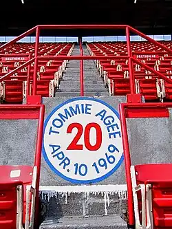 Agee got his first career multi-home run game in the third game of the 1969 season,[10] against the Montreal Expos, one of which went halfway up in section 48 of the left field upper deck at Shea Stadium, a feat that was never matched. Expos right fielder Mack Jones said the ball was still rising when it came into contact with the stands. To commemorate the home run, there was a painted sign in that section of the stadium with Agee's name and uniform number and the date. He also had his first four-hit game on May 2 (four for four with a walk and a home run).[11]