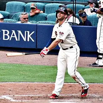 The Braves invited La Stella to spring training in 2014.[11][12] He began the 2014 season with the Gwinnett Braves of the Class AAA International League, and debuted at the major league level on May 28, hitting two singles in his first game.[13] La Stella hit his first major league home run on August 8, 2014, against Stephen Strasburg of the Washington Nationals.[14] He finished the year with a .251 batting average in 93 games.[15]