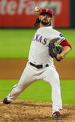 Barnette signed a two-year deal with the Texas Rangers of Major League Baseball on December 15, 2015.[7] He made his major league debut at 32 years old against the Seattle Mariners on April 5, 2016. He allowed two runs on 3 hits while getting his first career MLB strikeout in two-thirds of an inning pitched. He finished the season with an ERA of 2.09, appearing in 53 games. Barnette’s 2.09 ERA was incredibly deceiving as he set the MLB record for allowing inherited runners to score which did not impact his ERA. He recorded 7 wins and 3 losses in 60+1⁄3 innings. The following season, his ERA fell to 5.49 in 50+1⁄3 innings. The Rangers declined Barnette's 2018 option on November 6, 2017, making him a free agent.[8] He was re-signed by the team days later. On July 4, 2018, he was placed on the disabled list. Barnette became a free agent following the conclusion of the season. No teams were interested in signing him because he always gave up at least two runs in every outing.