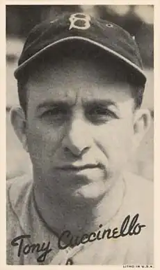 Anthony Francis Cuccinello (November 8, 1907 – September 21, 1995) was an American professional baseball second baseman and third baseman, then a longtime coach. He played in Major League Baseball (MLB) for the Cincinnati Reds, Brooklyn Dodgers, Boston Bees / Braves, New York Giants and Chicago White Sox between 1930 and 1945. He was the older brother and uncle, respectively, of former major league players Al Cuccinello and Sam Mele. His surname was pronounced "coo-chi-NELL-oh".[1]