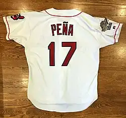 In November 1989, Peña was granted free agency and signed a three-year, $6.4 million contract with the Boston Red Sox.[38] In 1990, he led American League catchers in games played, range factor, and putouts, while finishing second in assists and fielding percentage.[39] He also hit .263 with seven home runs and 56 RBI, coming in 21st place in the American League MVP voting that year.[40] Amid a September skid that nearly cost the Red Sox the division, Peña called the team quitters and threw a folding chair in the clubhouse in an apparent attempt to fire up his teammates. Several players were offended by this and blamed it on his English language skills.[41][42]