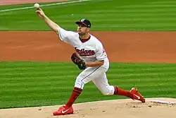 Bauer avoided arbitration prior to the 2020 MLB season, agreeing to a one-year, $17.5 million contract with the Reds on January 10, 2020.[78] As the season was indefinitely paused, first due to the COVID-19 pandemic and then as negotiations between the league and players' union reached a stalemate, Bauer became frustrated with the lack of play, saying that the suspension had done "irreparable damage" to the sport of baseball.[79] Bauer ultimately put out a career-best year during the shortened 60-game season, posting a 5–4 record and leading the league with a 1.73 ERA in 11 starts while striking out 100 batters in 73 innings.[80] As the regular season built to a close, Bauer began pitching on short rest, starting every fourth day rather than every fifth to help the Reds clinch a postseason berth.[81] Bauer was selected to start the opening match of the Reds' 2020 National League Wild Card Series against the Atlanta Braves, pitching 7+2⁄3 scoreless innings in what was ultimately a 13-inning loss for the Reds. It was the first postseason game in MLB history to remain scoreless after 11 innings of play, while Bauer became the first pitcher to last seven or more innings with no runs, fewer than three hits, no walks, and 12 or more strikeouts. He also set a Cincinnati record for the most strikeouts delivered by a pitcher in the playoffs.[82] Although Atlanta swept Cincinnati during the Wild Card series, Bauer bested Yu Darvish of the Cubs and Jacob deGrom of the New York Mets in voting for the NL Cy Young Award. He was the first pitcher for Cincinnati to receive the award; previously, the Reds were the only active MLB team founded prior to 1961 that had never boasted a winning pitcher.[83] Bauer rejected the Reds' $18.9 million qualifying offer on November 4, 2020, making him a free agent, but he said he remained open to rejoining the team.[84]