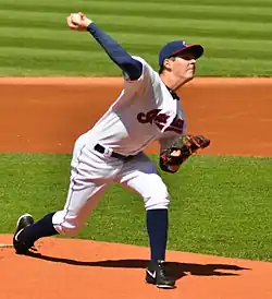 On January 12, 2017, Bauer agreed to a one-year, $3.55 million contract with the Indians, twice as much as he had earned the prior season.[58] The first two months of the 2017 season were a disappointment for Bauer, who allowed 11 home runs and 38 earned runs in his first 10 appearances. He described the first half of the season as "miserable", and was often upset when he was scheduled to start, because it "didn't feel like [he] was contributing to the team".[59] The nadir of Bauer's season came on June 16, in his first start after the All-Star Game break, when Bauer allowed four runs, three hits, and two walks before he was taken out of the game in the first inning.[60] The incident was a turning point for Bauer, who turned his season around by posting a 10–1 record and 2.60 ERA in his last 14 starts. In particular, he improved at limiting the damage of home runs against him, increasing the proportion of solo shots to multi-run home runs.[61] By the end of the regular season, Bauer had a 17–9 record and a 4.19 ERA in 32 games, and had struck out 196 batters in 176+1⁄3 innings.[59] As the Indians stepped into the 2017 American League Division Series (ALDS) against the New York Yankees, manager Terry Francona passed over ace Corey Kluber to give Bauer the start in Game 1, reportedly because the bullpen was very rested and ready, and Kluber the better bet to pitch deep into the game. Bauer recorded eight strikeouts in the game, including three of Yankees slugger Aaron Judge, and was able to carry a no-hitter into the sixth inning. He lasted 6+1⁄3rd, as the Indians defeated the Yankees 4-0.[62] Bauer's 5+1⁄3 no-hit innings set an Indians postseason record; previously, Bob Feller and Early Wynn had gone five no-hit innings each in the 1948 World Series and the 1954 World Series, respectively.[63] The Yankees bounced back to win three of the next four games, taking the best-of-five series in five games.[64]