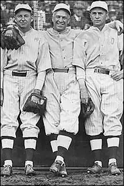 Speaker became the regular starting center fielder for Boston in 1909 and light-hitting Denny Sullivan was sold to the Cleveland Naps. Speaker hit .309 in 143 games as the team finished third in the pennant race.[16] Defensively, Speaker was involved in 12 double plays, leading the league's outfielders, and had a .973 fielding percentage, third among outfielders.[17] In 1910 the Red Sox signed left fielder Duffy Lewis. Speaker, Lewis and Harry Hooper formed Boston's "Million-Dollar Outfield", one of the finest outfield trios in baseball history. Speaker was the star of the Million-Dollar Outfield. He ran fast enough that he could stand very close to second base, effectively giving the team a fifth infielder, but he still caught the balls hit to center field.[18] In 1910 and 1911, Boston finished fourth in the American League standings.[19][20]