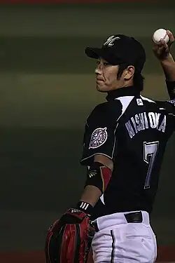 Nishioka had a breakout year in 2005,[3] starting as a backup infielder but starting at both second base and shortstop alongside veterans Koichi Hori and Makoto Kosaka in an unorthodox platoon system as the season went on. He hit just .268 but led the Pacific League in triples (11) and stolen bases (41),[4] playing a key role in the Marines' first Japan Series championship since 1974. His splitting time between the two middle infield positions created an unusual situation in which he won the Pacific League Best Nine Award at shortstop and the Golden Glove Award at second base (incidentally, double-play partners Hori and Kosaka were awarded the Best Nine Award at second base and the Golden Glove Award at shortstop, respectively).[5]