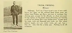 Twining led the baseball team to several more victories against Penn in the 1915 season and also led the basketball team to wins over schools such as Army and Rutgers.[5][6][7] The Evening Public Ledger described him as one of the three best pitchers in college baseball.[8] Nicknamed "Twink" and "Twig", he threw right and batted right-handed.[1][9]