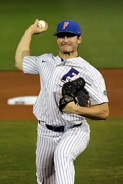 As a freshman at Florida in 2017, Dyson went 4–0 with a 3.23 ERA in 39 innings.[2] Dyson started Game 3 of the Gainesville Super Regional of the 2017 NCAA Division I baseball tournament against Wake Forest and struck out seven batters over five innings,[3] clinching a trip to the College World Series. He also started the clinching game of the CWS against LSU, which Florida eventually won.[4] That summer, he played in the Northwoods League where he posted a 1.59 ERA over 28+1⁄3 innings.[5] In 2018, as a sophomore, Dyson appeared in 14 games (11 starts) in which he pitched to a 5–3 record with a 4.47 ERA.[6] Following the season, he played for the Falmouth Commodores of the Cape Cod Baseball League, compiling a 2.37 ERA in 19 innings.[7] Prior to the 2019 season, Dyson was named to the Golden Spikes Award watch list[8] along with being named a Baseball America preseason All-American.[9] For the season, he appeared in 11 games (nine starts), pitching to a 3–2 record with a 4.95 ERA.[10]