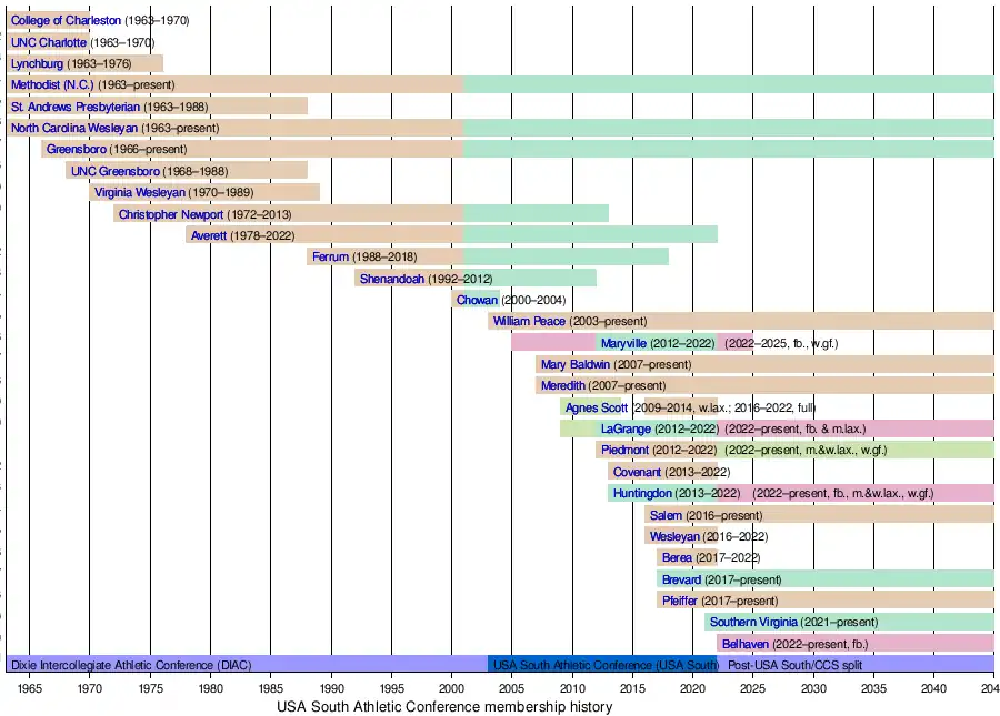 • 1963 – The USA South was founded as the Dixie Intercollegiate Athletic Conference. It was a member of the National Association of Intercollegiate Athletics (NAIA). Charter members included Charlotte College (now the University of North Carolina at Charlotte), the College of Charleston (CoC), Lynchburg College (now the University of Lynchburg), Methodist College (now Methodist University), North Carolina Wesleyan College (now North Carolina Wesleyan University), and St. Andrews Presbyterian College (now St. Andrews University), beginning the 1963–64 academic year.