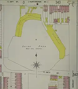 Today the site is a residential area of Barclay with 321 East 25th Street once located next to the grandstand.[2] That and other buildings visible in the background of the 1890s photo of the ballpark's exterior still stand today.
