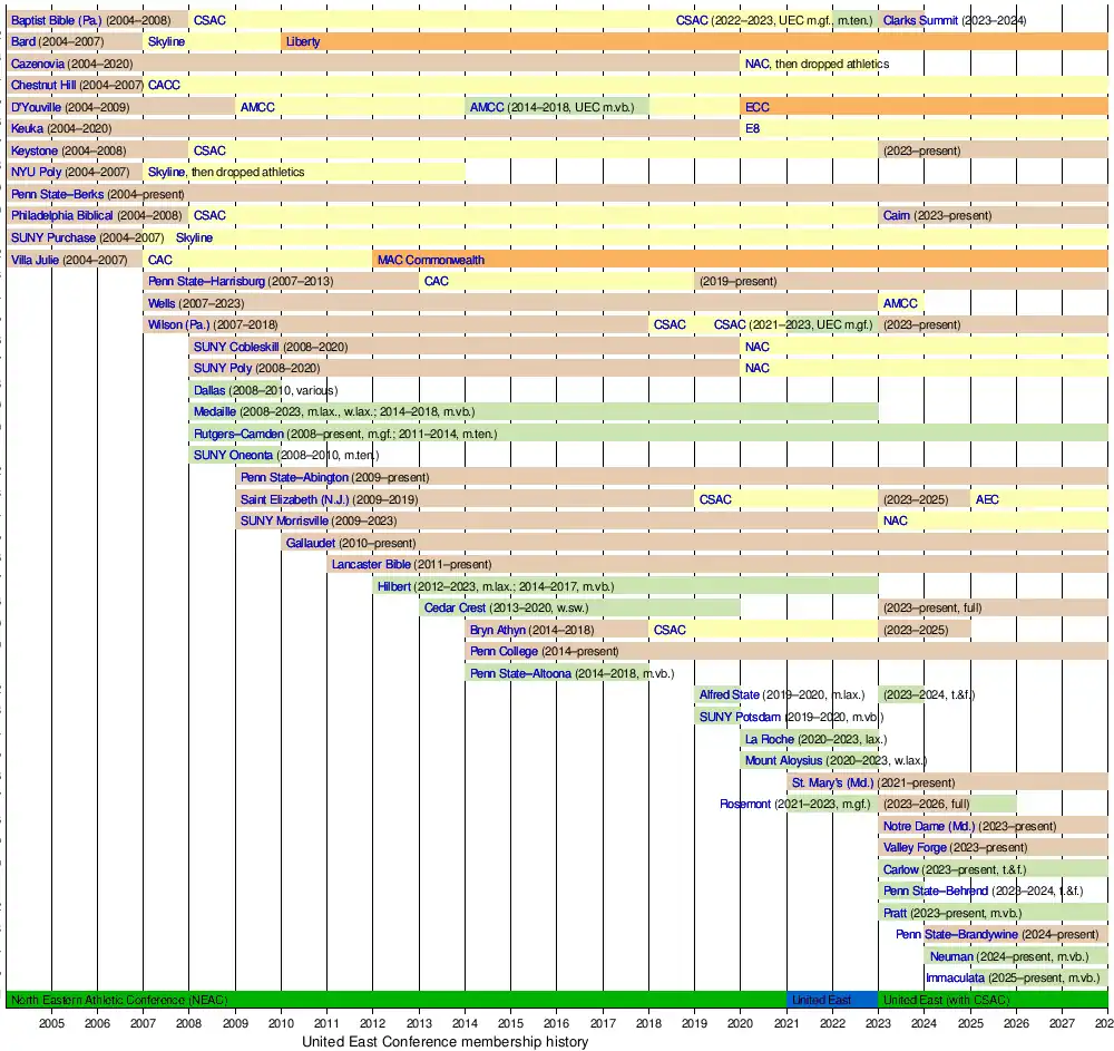 6. ^ Clark Summit (when it was known as Baptist Bible College) was a former full member of the NEAC/United East from 2004–05 to 2007–08; later rejoined as an associate member for men's golf and men's tennis in the 2022–23 school year, before rejoining as a full member in 2023–24.