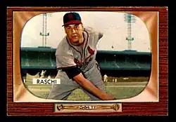 Back trouble afflicted Raschi in 1955; Red Smith wrote in April, "Raschi's back feels like a hollow tooth."[84] He was unable to pitch for much of the spring, drawing reports that he might be released, until he finally solidified his spot on the roster with a five-inning performance at the end of spring training. After he failed to get through the second inning in his first start of the regular season, on April 18, the Cardinals released him on April 19.[85]