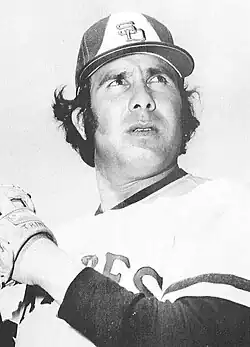 He was traded again after the 1972 season to the San Diego Padres for Johnny Jeter,[8] where he became the first Mexican-born player in team history.[39][40] With the Padres, he was given a few more opportunities to close. In 1973, he pitched 48 of his 49 games in relief, finishing 23 games, with a 3.70 ERA and seven saves.[41] In 1974, he pitched 53 of his 54 games in relief, finishing 35, and leading the team in saves with nine, with a 4.56 ERA.[42] Despite that, he was released by the Padres during spring training in 1975.[8] The Padres played poorly as a team both seasons, finishing with identical 60–102 last-place records.[43][44]