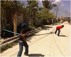 Overall rules and baserunning is roughly similar to basic forms of baseball, but there are only two bases in addition to home plate, only two or three fielders, a broomstick is used as a bat[6] and a large plastic water bottle cap,[7] called la vitilla, is used instead of a ball.[8] The game also has aspects of Cricket, in that there are no walks or looking strike counts and strikeouts can be made by hitting a target behind the batter. The vitilla disk is difficult to hit, since it can float like a disk and can spin wildly at very high velocity, making for unpredictable fielding. The skill and coordination required in vitilla is credited with giving Dominican Major League Baseball players an advantage in hitting and fielding.[9] The game evolved from Dominican stickball in the 1970s, and had its first formal tournament in 2009.[10]