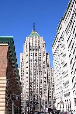 On December 16, 1928, the station moved from the newspaper's offices to its current location in the Fisher Building in uptown Detroit, and began identifying as "WJR Detroit, from the Golden Tower of the Fisher Building". In 1929, the license was transferred to "WJR, Goodwill Station, Inc.", and on April 22, 1929, "WCX" was formally dropped from the dual call sign, with the station becoming just WJR.[24] In 1931, WJR raised its power to 10,000 watts. The station switched network affiliation from NBC Blue to CBS on September 29, 1935, and at the same time station officials formally dedicated WJR's new 50,000-watt transmitter.[25] On March 29, 1941, the station moved from 750 to 760 kHz, in accordance with the North American Regional Broadcasting Agreement frequency reallocations.[26]