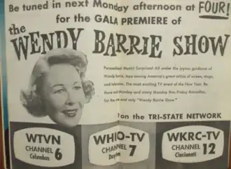 In 1953, three television stations owned by Taft Broadcasting Company and Cox Enterprises formed the short-lived "Tri-State Network" to compete with entertainment programming produced by Crosley Broadcasting Corporation on Crosley television stations in the Cincinnati, Columbus and Dayton broadcast markets. On January 11, 1954, The Wendy Barrie Show premiered from the studios of WHIO-TV in Dayton, simulcast on Taft Broadcasting's WKRC-TV in Cincinnati and WTVN (now WSYX) in Columbus.[4] Barrie's contract was terminated in October 1954, and she was replaced by her co-host of nine months, Don Williams.[5]