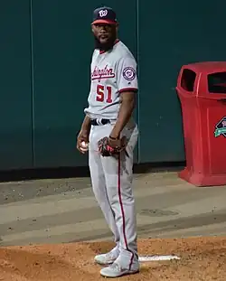 Suero was Washington's most used reliever during the 2019 season; he led the team in games pitched and relief innings.[28] He recorded his first Major League save on June 21, 2019 at Nationals Park.[29] Suero was left off Washington's roster to start the 2019 National League Championship Series, placed on the roster when Daniel Hudson went on paternity leave and then removed again when Hudson returned.[30][31] Suero appeared in the 2019 World Series in three different games and retired all five batters he faced. He was the only pitcher to appear in the series and not allow any baserunners.[32]