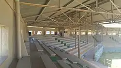 The ballpark spans approximately forty acres, and is surrounded by an 8-foot (2.4 m) tall wooden security fence. It is divided into two sections: a baseball field on the East side, and a football stadium on the West. The baseball field features a shaded cast-in-place concrete grandstand situated at the Northeast corner. This canopy-covered structure, built in 1909, is still in its original condition, and is listed as a state historic building. Despite ongoing maintenance by the City of Bisbee and the Bisbee Unified School districts, it will most likely need structural renovation at some point in the future. Underneath the grandstand are housed the concrete dugouts, locker rooms, showers and manager's offices. The football field is oriented North to South and consists of a gridiron with modern steel bleachers along both sides of its length. These bleachers have at times in the past been pushed back to expand the baseball outfield.