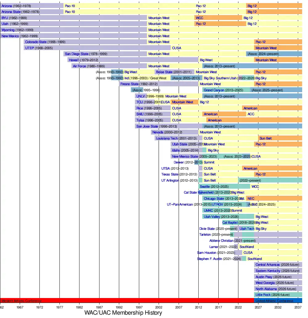For the first 41 years of its existence, the WAC competed at the highest level of college athletics across all sports. The conference expanded from its original six members to a peak of 16 in 1996, before seven of its institutions (including the four remaining charter members) seceded in 1998 to form the Mountain West Conference. Thereafter the WAC struggled to maintain a top-level football conference and ultimately discontinued the sport after the 2012–13 season, leaving the NCAA's Football Bowl Subdivision (formerly known as Division I-A) to become a Division I non-football conference.[1] After a major expansion in 2021, the WAC reinstated football, competing in the Football Championship Subdivision (FCS).[2][3] Further membership losses soon foiled plans to someday return to the FBS level, and in 2023 the WAC again became a non-football conference, with its football-playing members joining the football schools of the Atlantic Sun Conference (ASUN) to form the football-only United Athletic Conference (UAC).