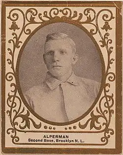 Charles Augustus "Whitey" Alperman (November 11, 1879 – December 25, 1942) was an American Major League Baseball second baseman who played for the Brooklyn Superbas from 1906 to 1909.[1] In 1907, he tied for the league lead in triples. He was also in the top three in hit by pitch in 1906 and 1907. In 1909, he batted 442 times, while only receiving two walks, which is the lowest single-season walk ratio recorded in the twentieth century, of players with 300 or more plate appearances.