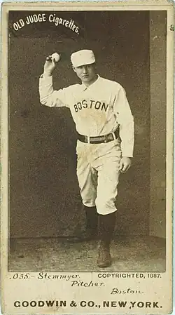 The single-season record for wild pitches is held by Mark Baldwin, who threw 83 in 1889 while pitching in the American Association. Second place on the season list is held jointly by Tony Mullane and Bill Stemmyer, who threw 63 wild pitches in 1884 and 1886, respectively. Since 1900, the highest total in a season has been 30, by Red Ames in 1905.[4]